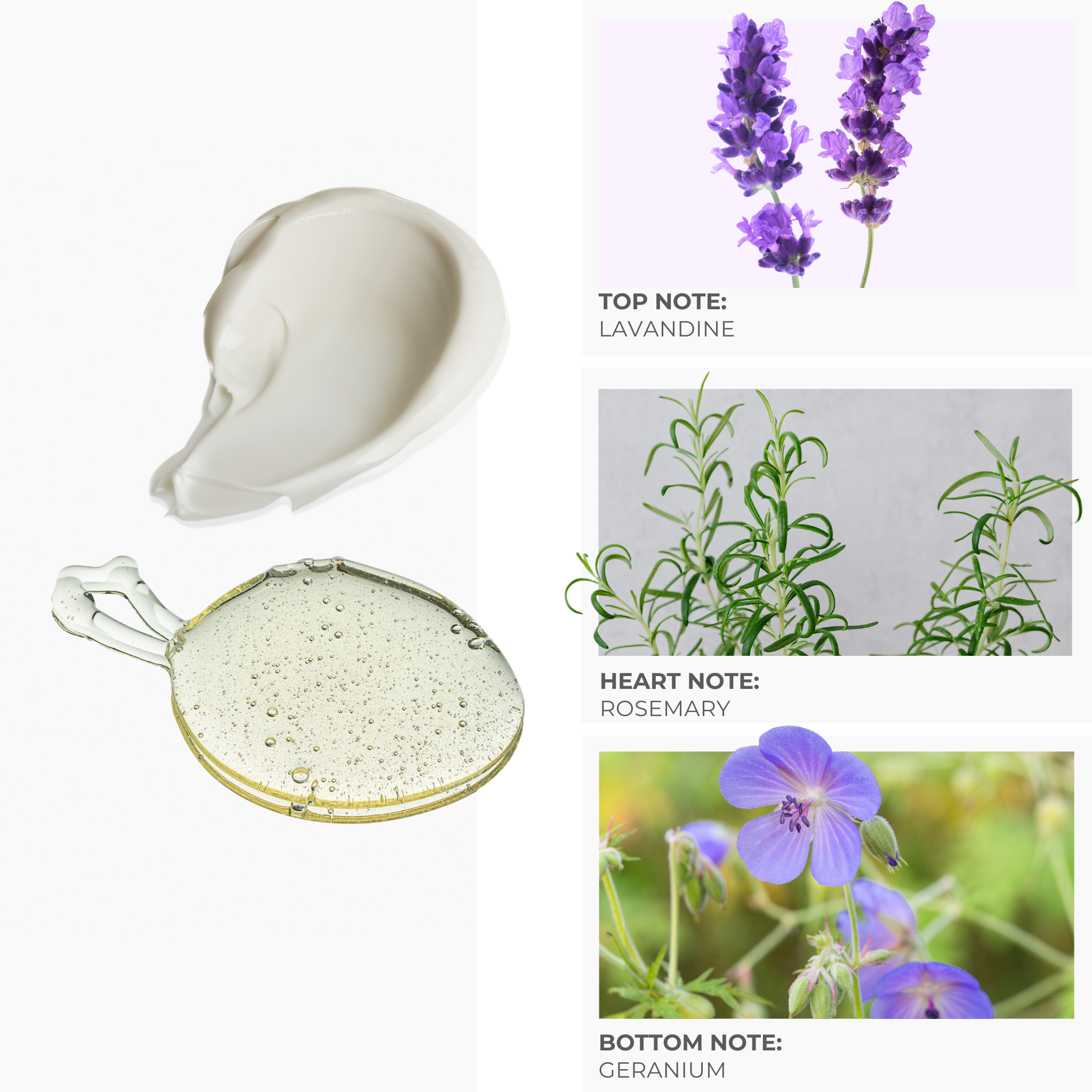 Indeholder: blødgøringsmidler og emulgatorer af naturlig oprindelse, sheasmør*, lavandin æterisk olie*, aloe vera*, rosmarin æterisk olie*, geranium æterisk olie*, konserveringssystem.