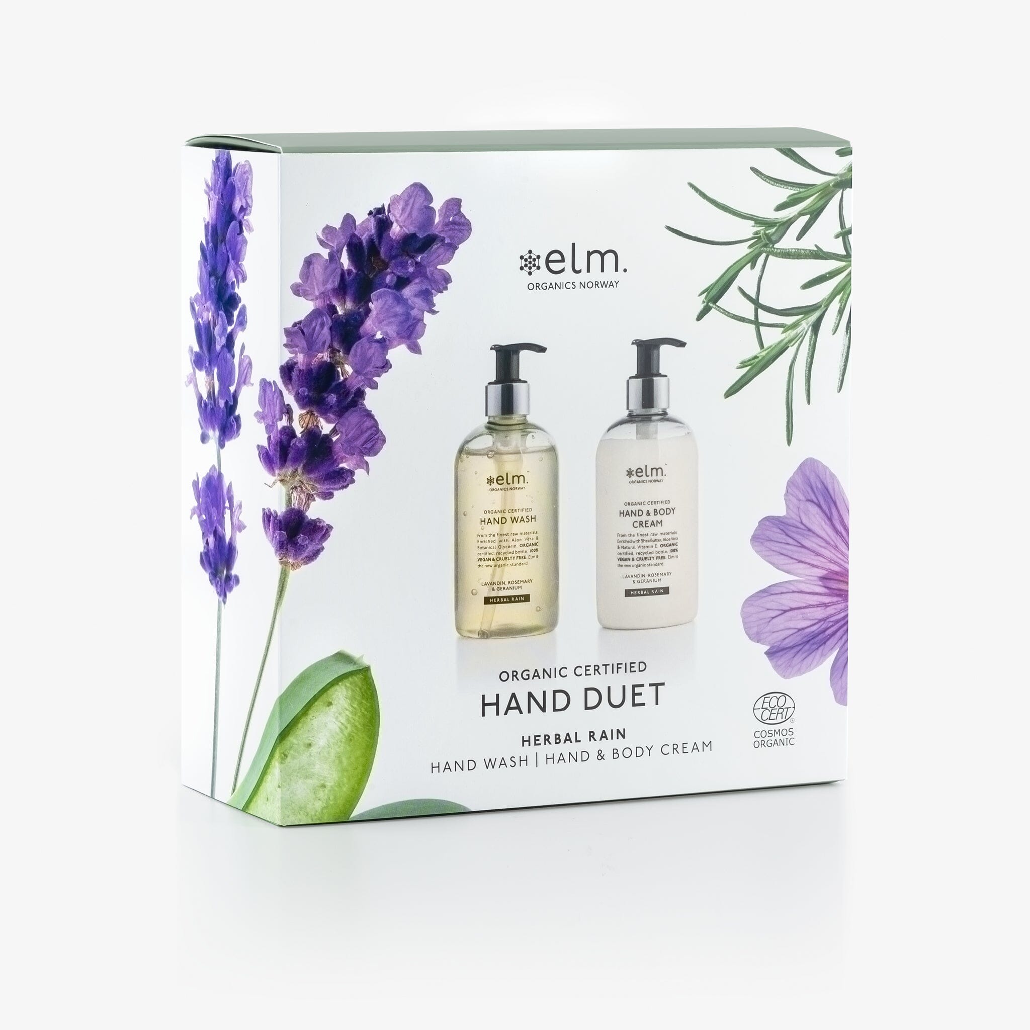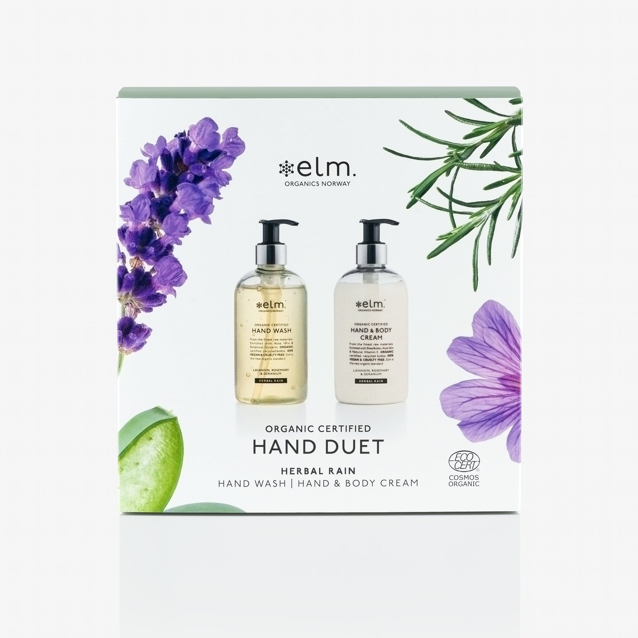 Nyheder! Håndduet i smukt gavesæt. To yndlingsprodukter, der passer godt på dine hænder, med rene økologiske ingredienser. Vores helt nye og eksklusive duft, Herbal Rain, har en forfriskende duft af lavendel med urtefriskhed. Geranium tilføjer en let sødme, mens rosmarin tilføjer en aromatisk, grøn krydderinote. En afbalanceret duft, der giver huden renhed og energi.