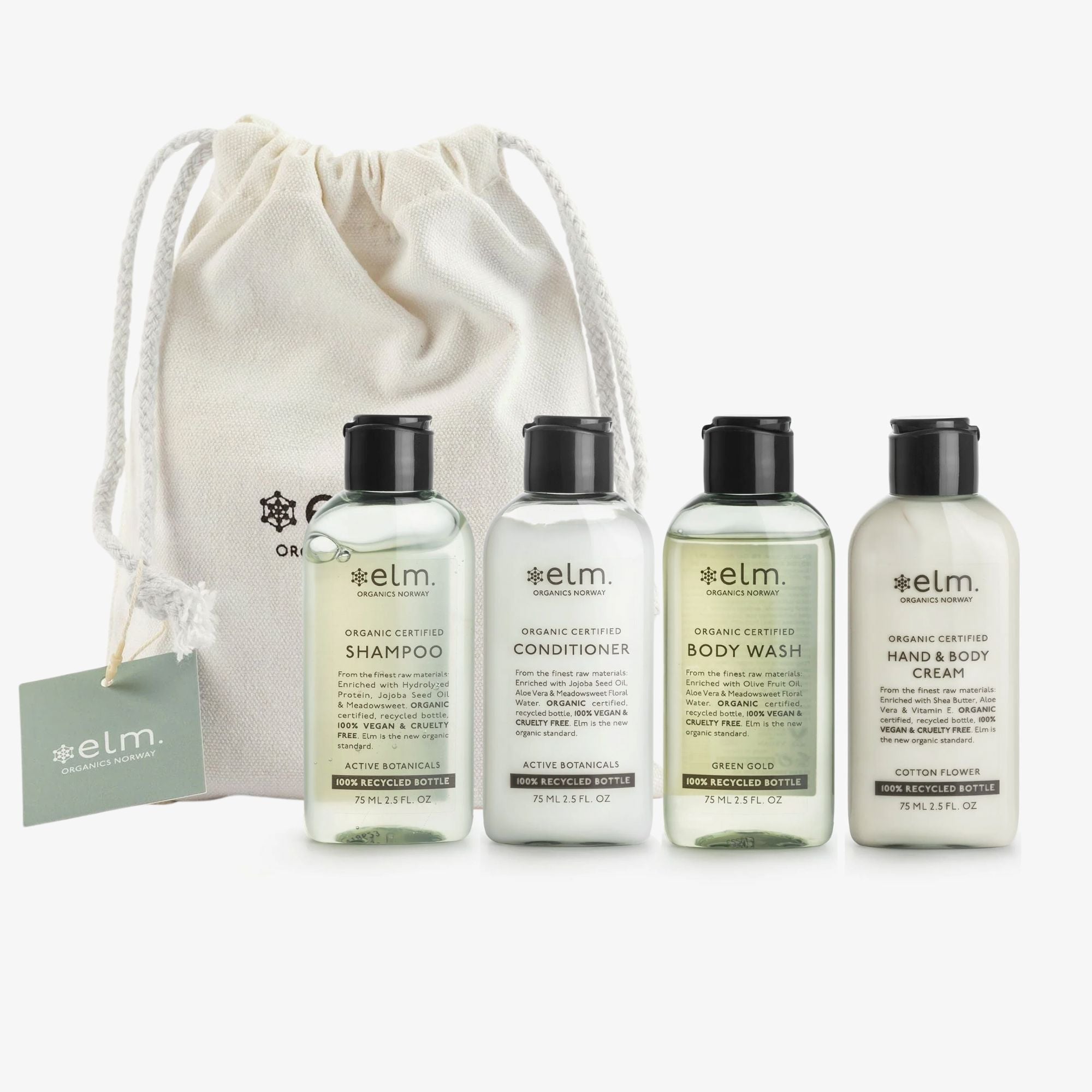 Elm Organics Travel Kit indeholder fire nøje udvalgte produkter i rejsestørrelse sammen med vores eksklusive toilettaske.