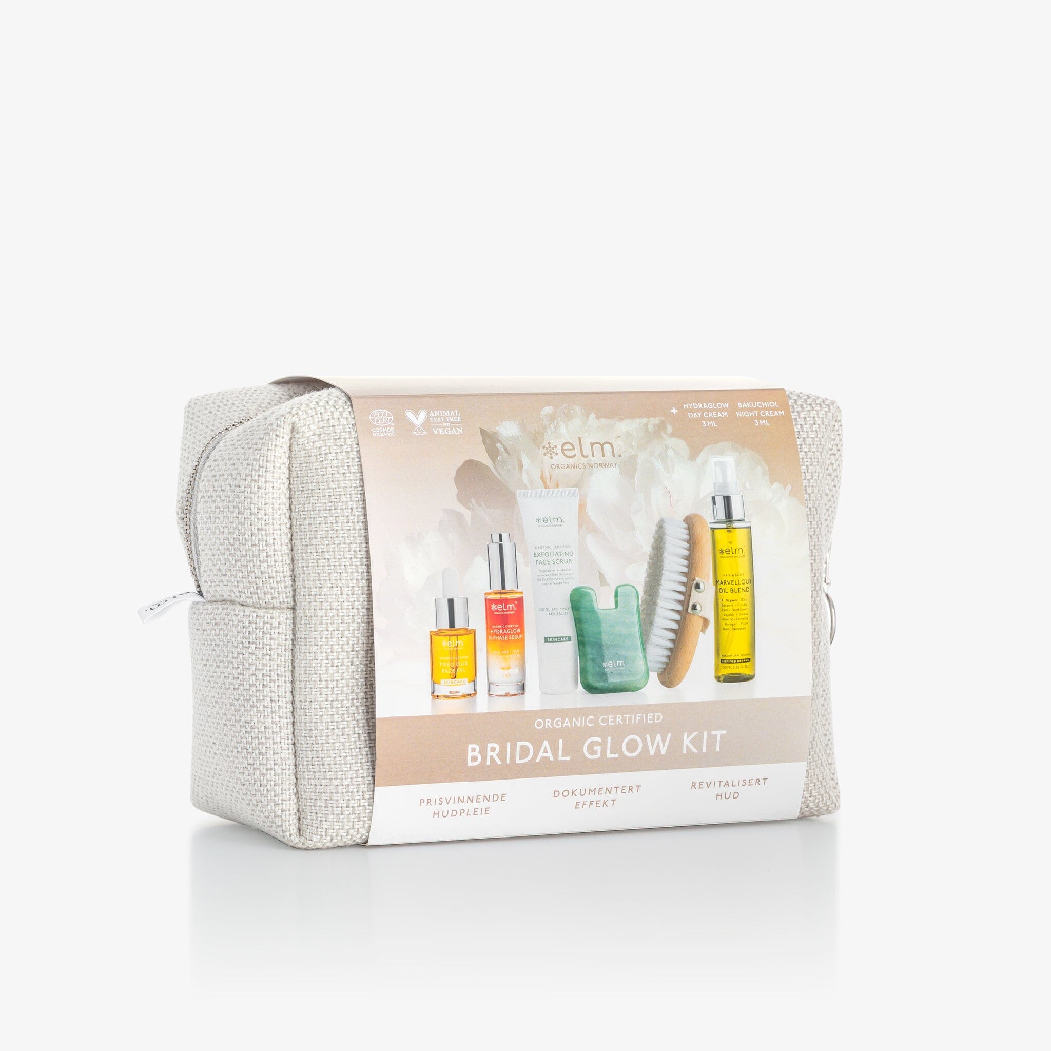 Bridal Glow Kit kommer i vår eksklusive og håndlagde Eden Toiletry Pouch.